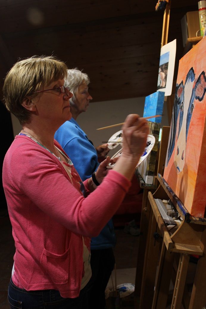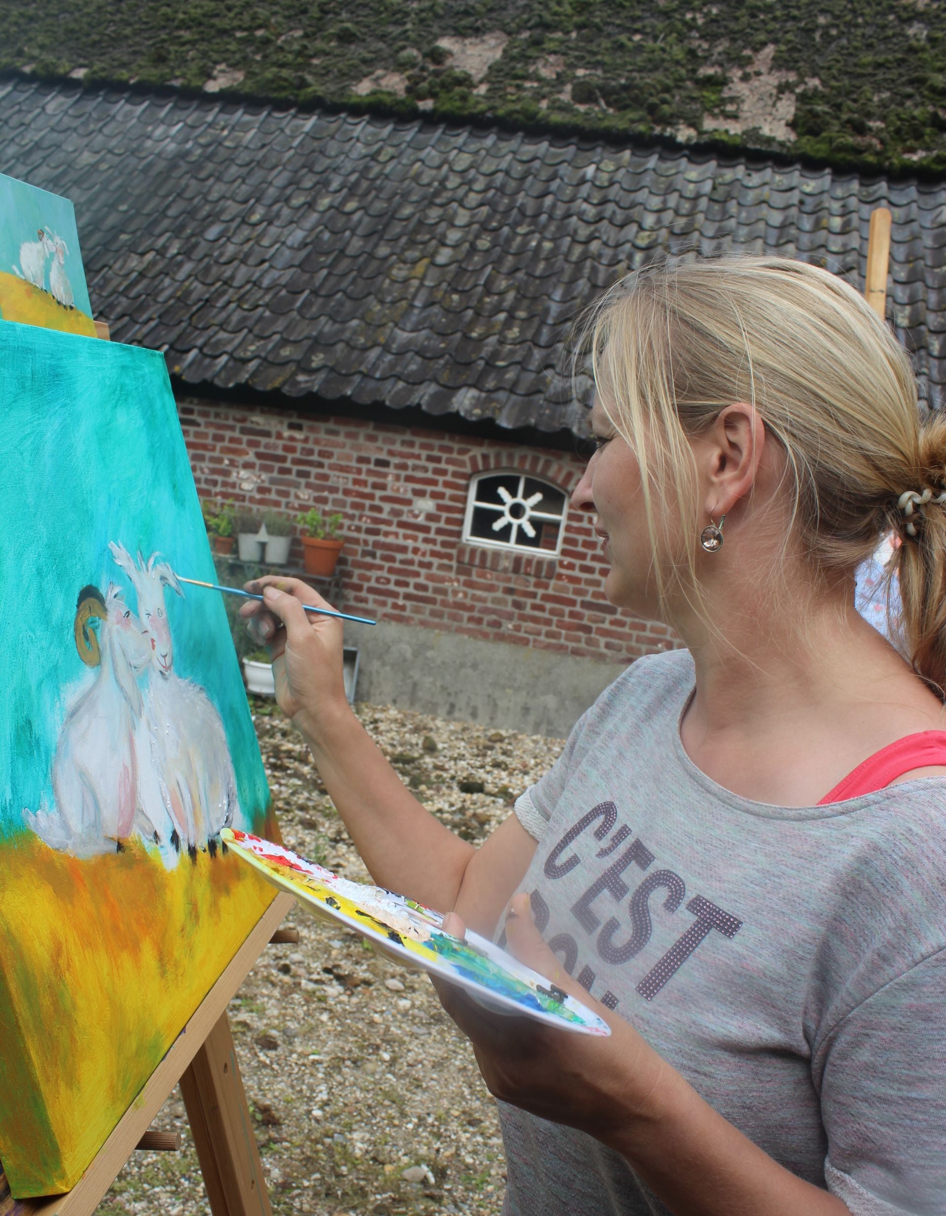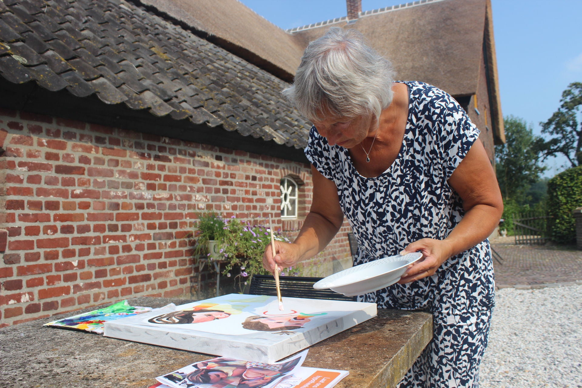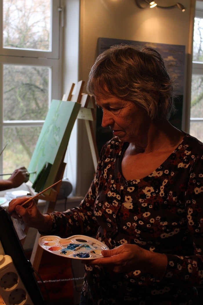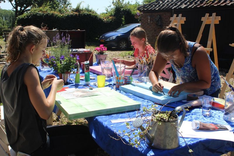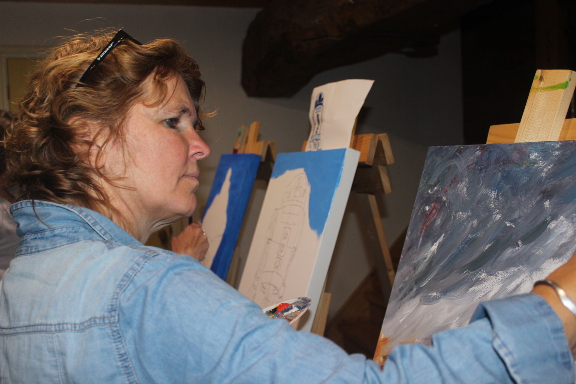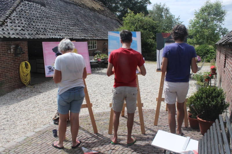 We starten met een kopje koffie of thee en maken een eerste opzet op een doek van 50 x 50 cm. Bij mooi weer schilderen we buiten.