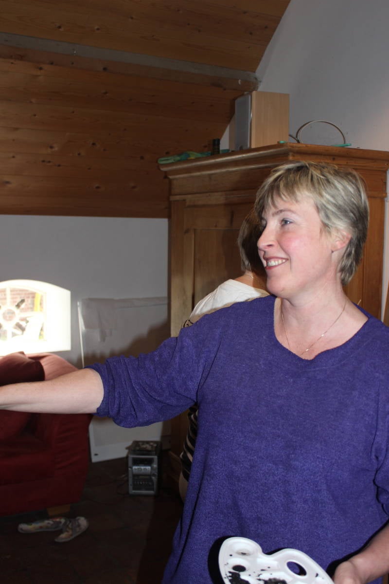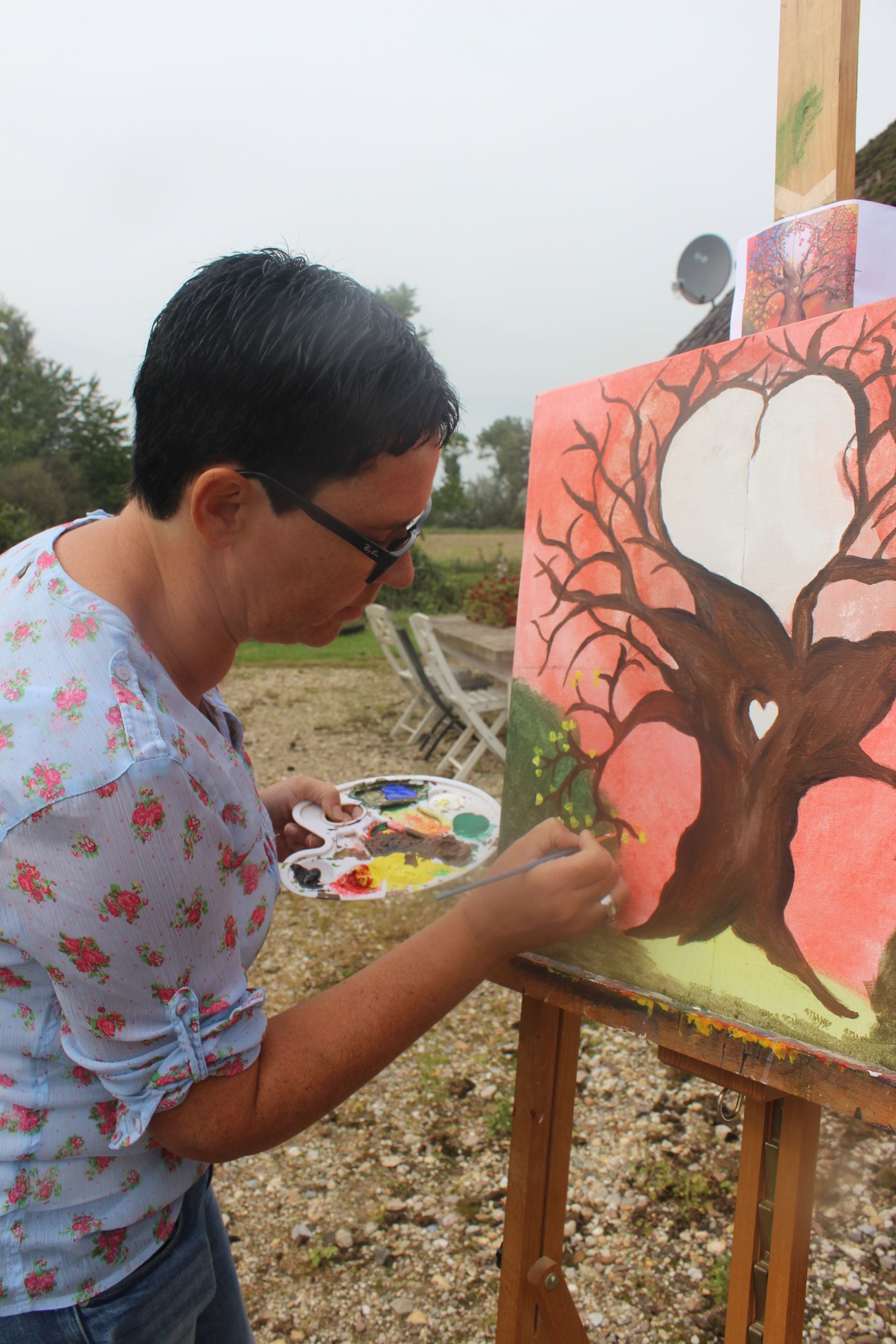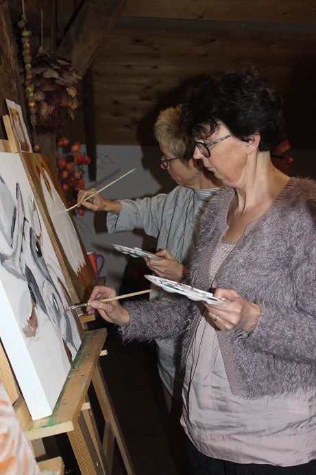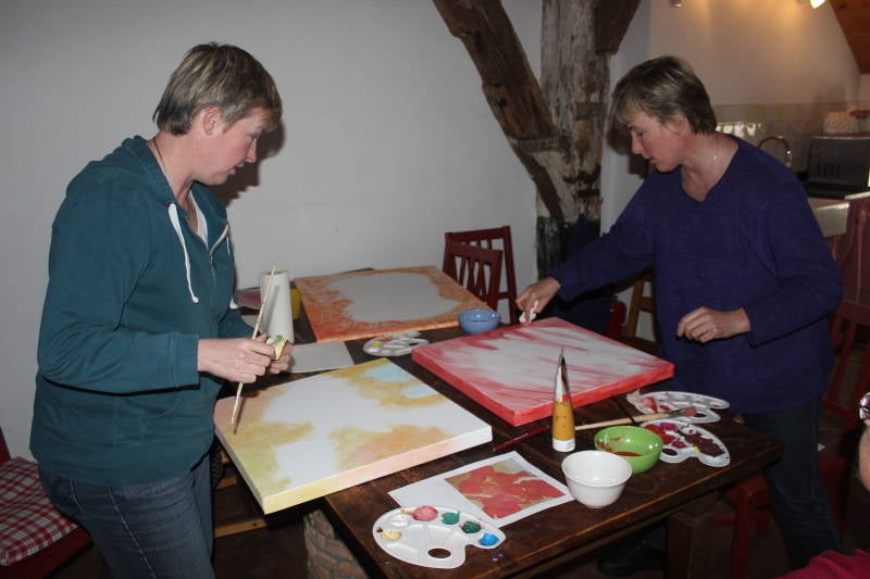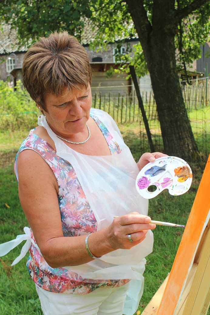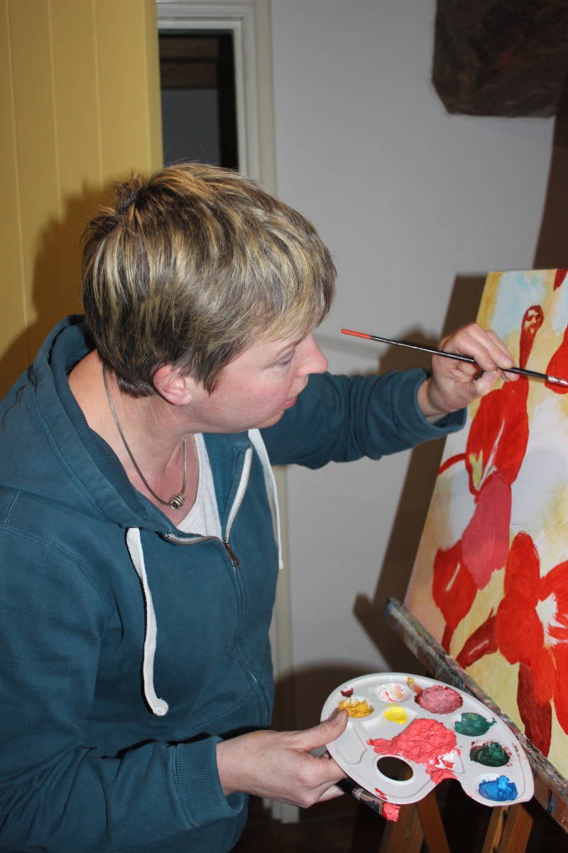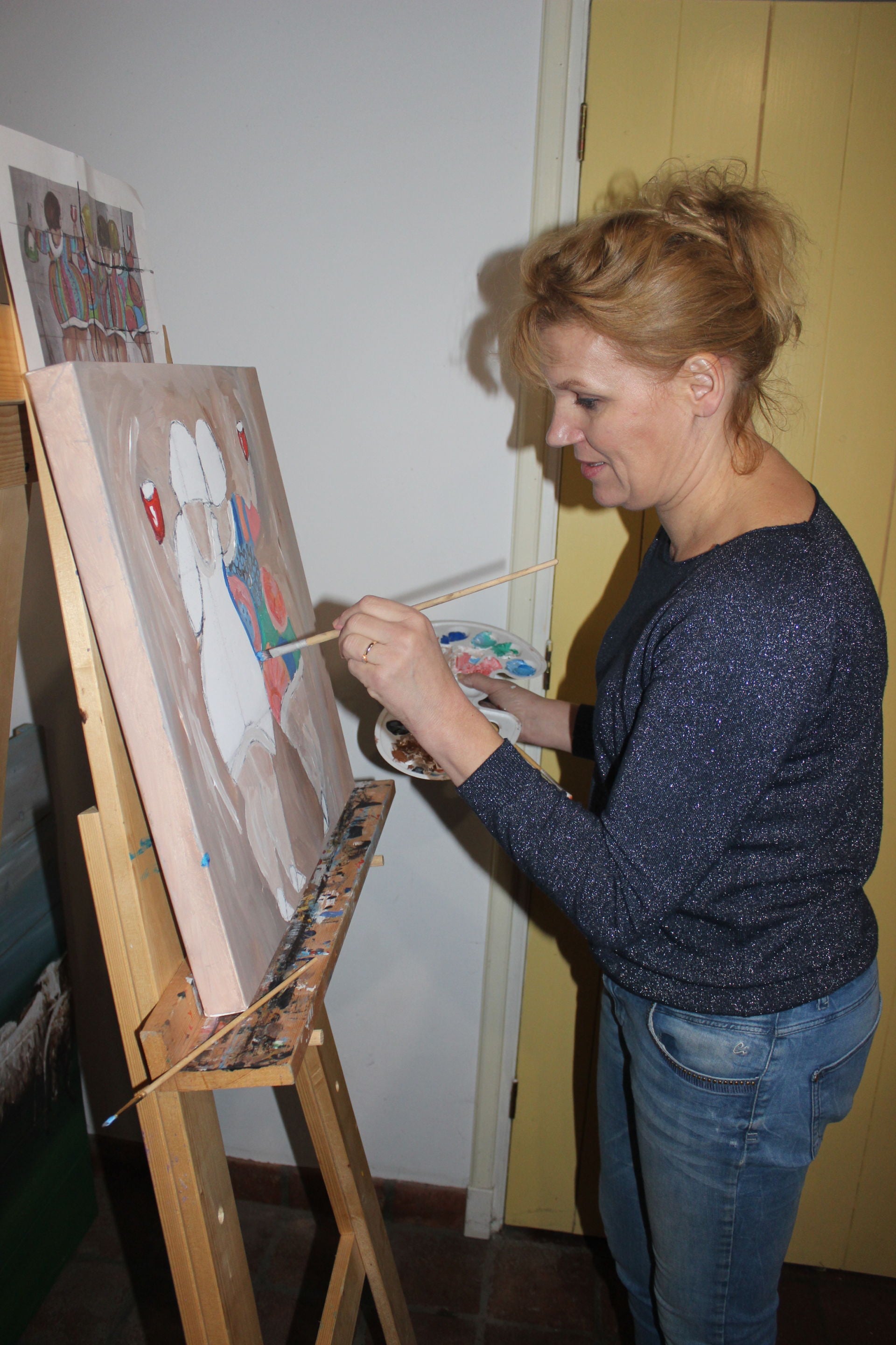 We starten met een kopje koffie of thee en maken een eerste opzet op een doek van 50 x 50 cm. Bij mooi weer schilderen we buiten.