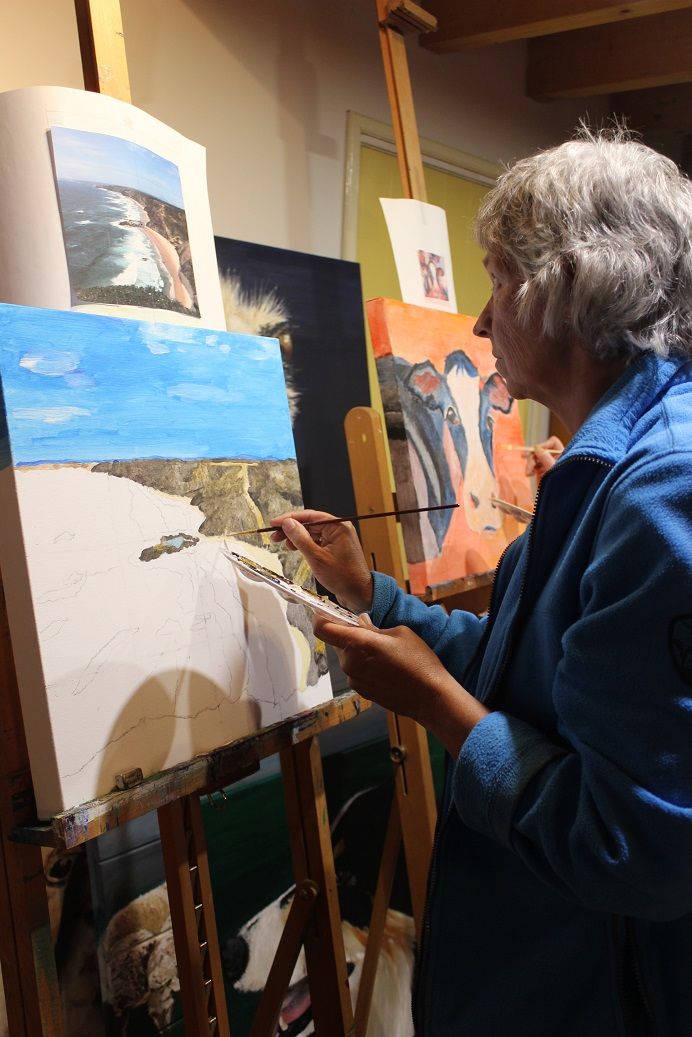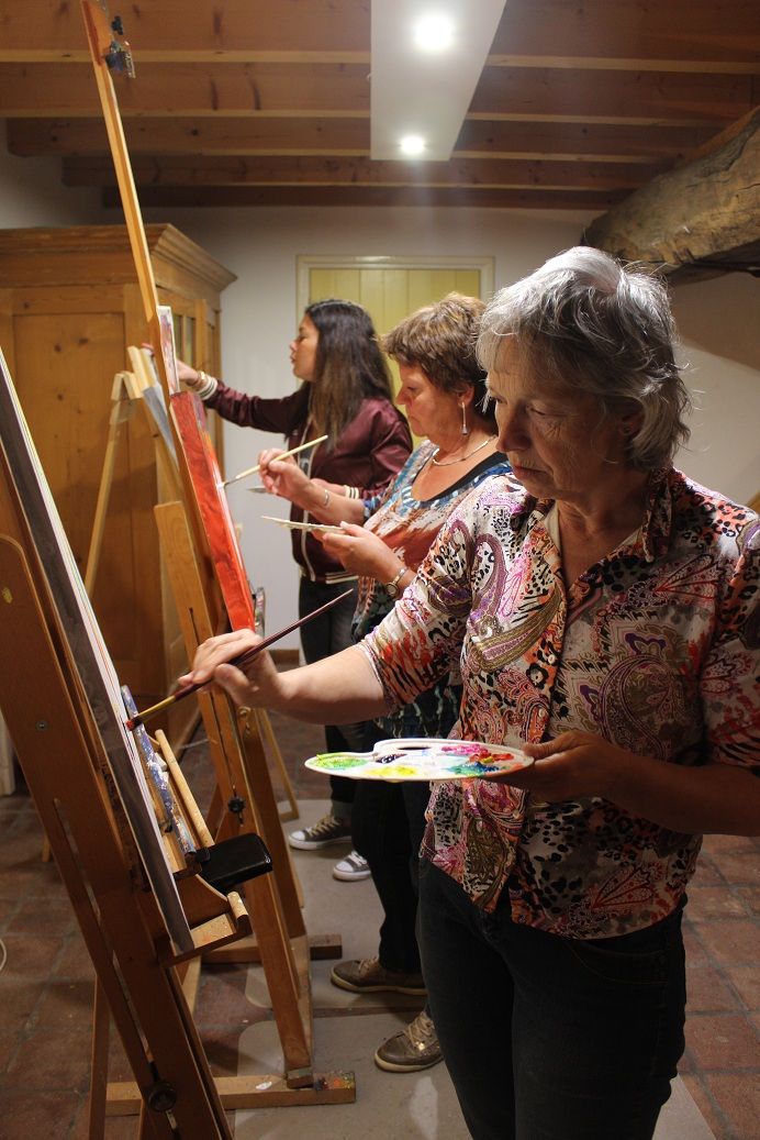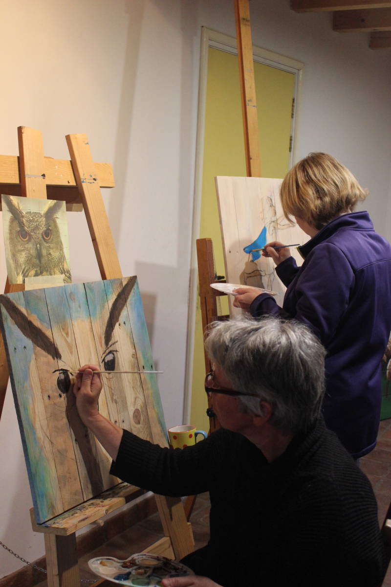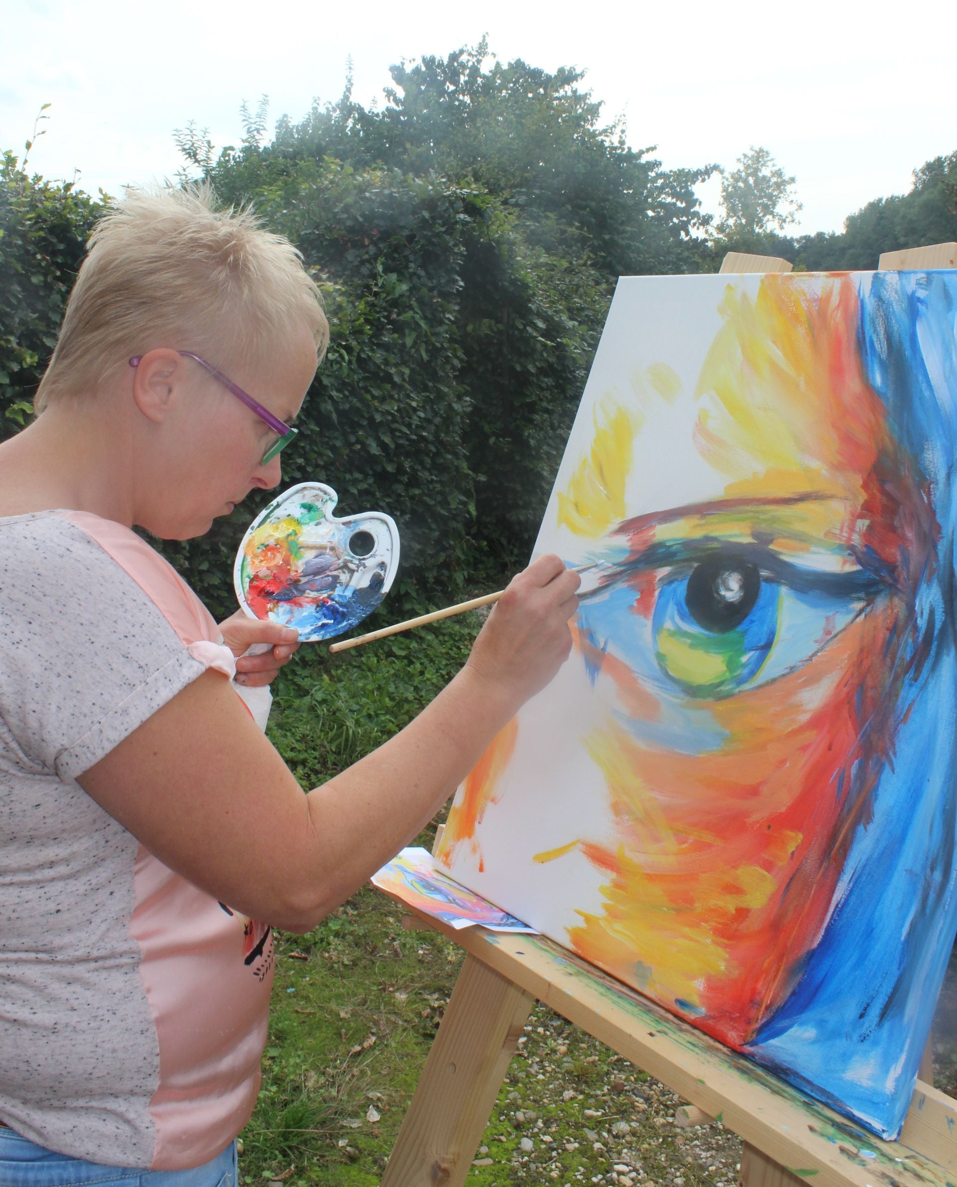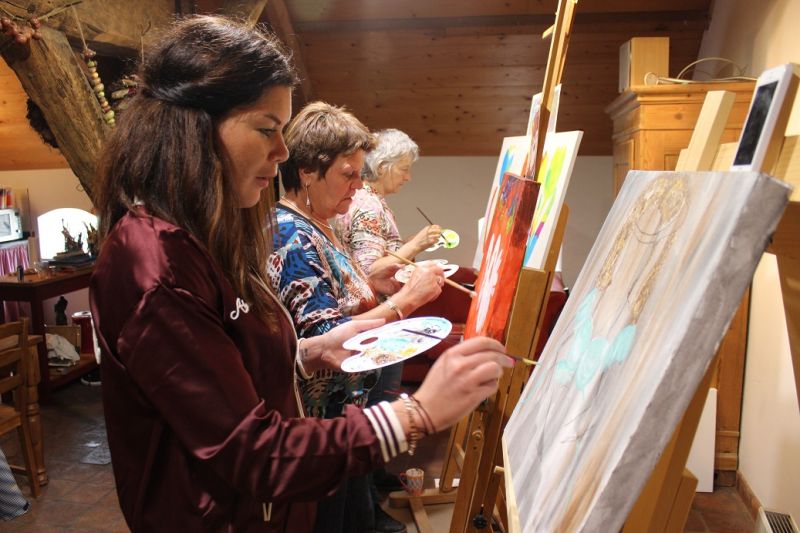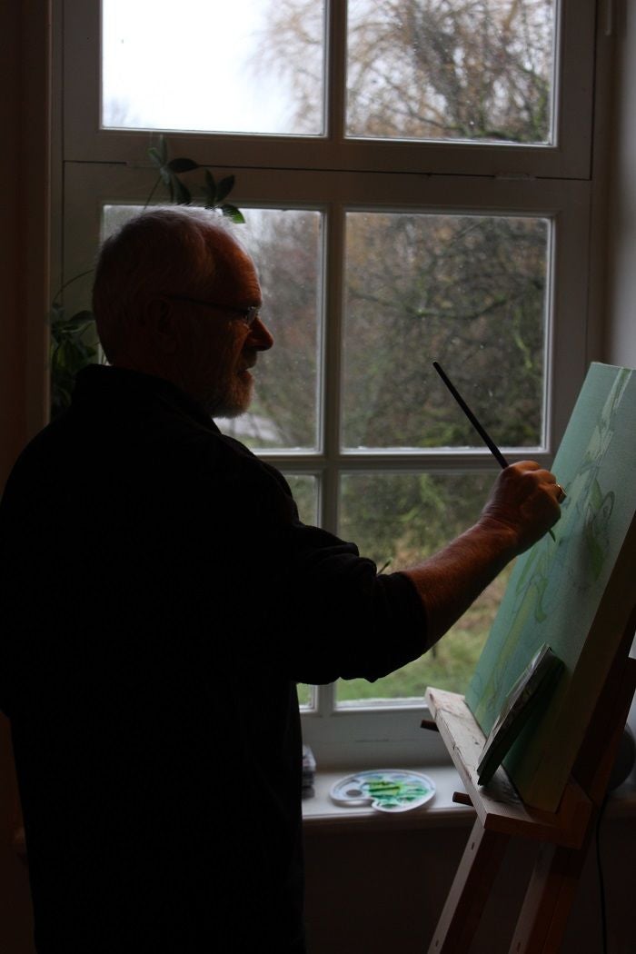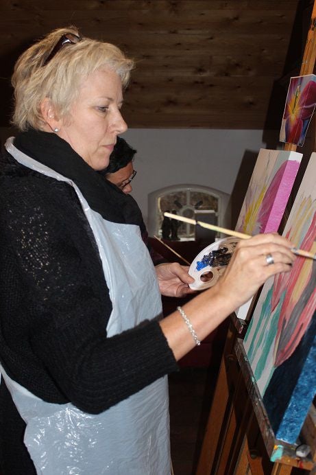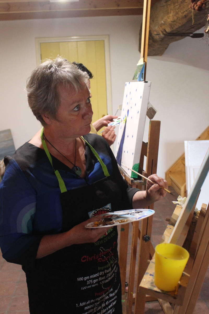 We starten met een kopje koffie of thee en maken een eerste opzet op een doek van 50 x 50 cm. Bij mooi weer schilderen we buiten.