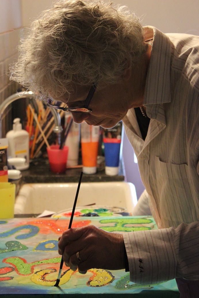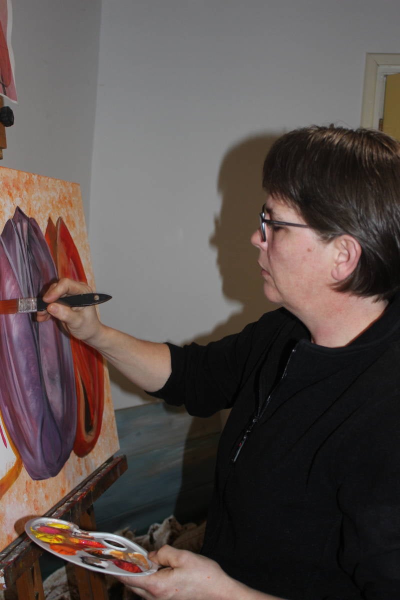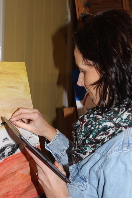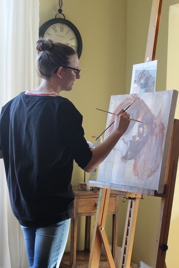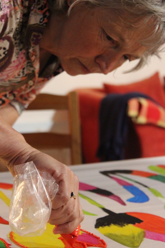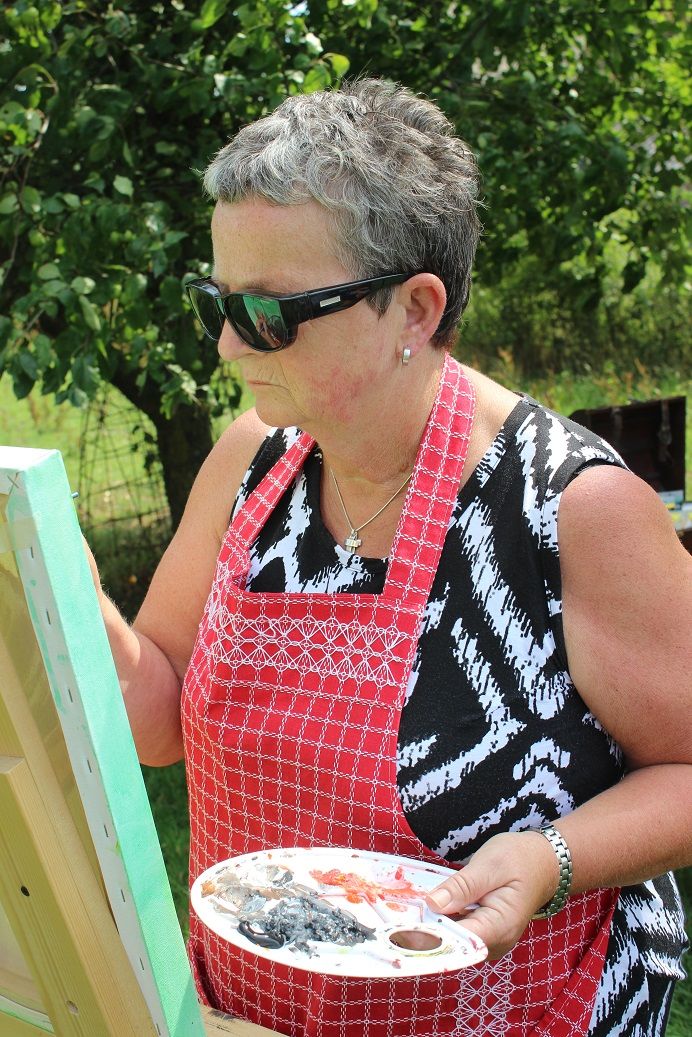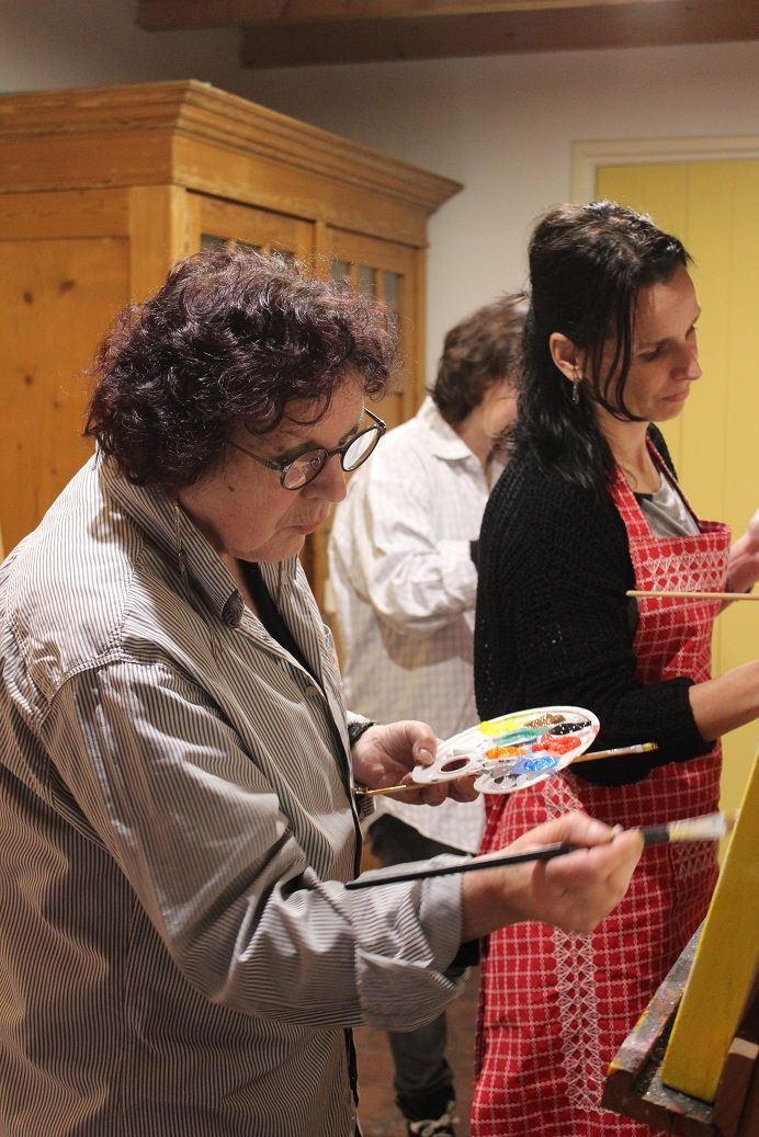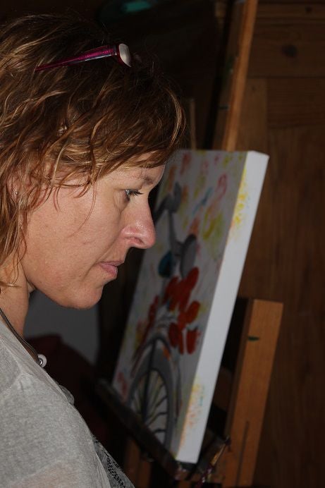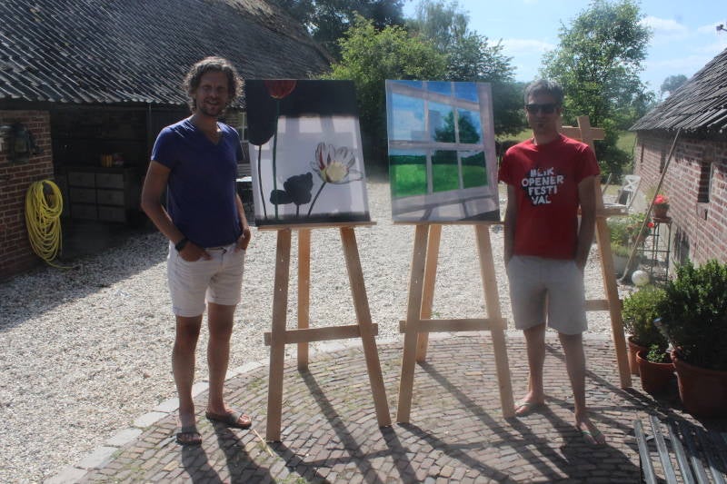 We starten met een kopje koffie of thee en maken een eerste opzet op een doek van 50 x 50 cm. Bij mooi weer schilderen we buiten.