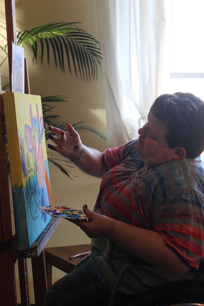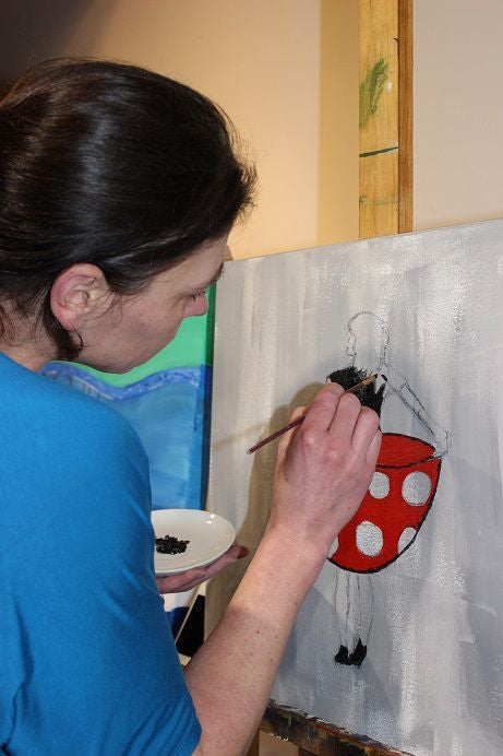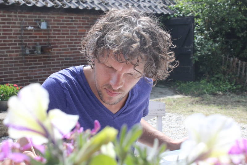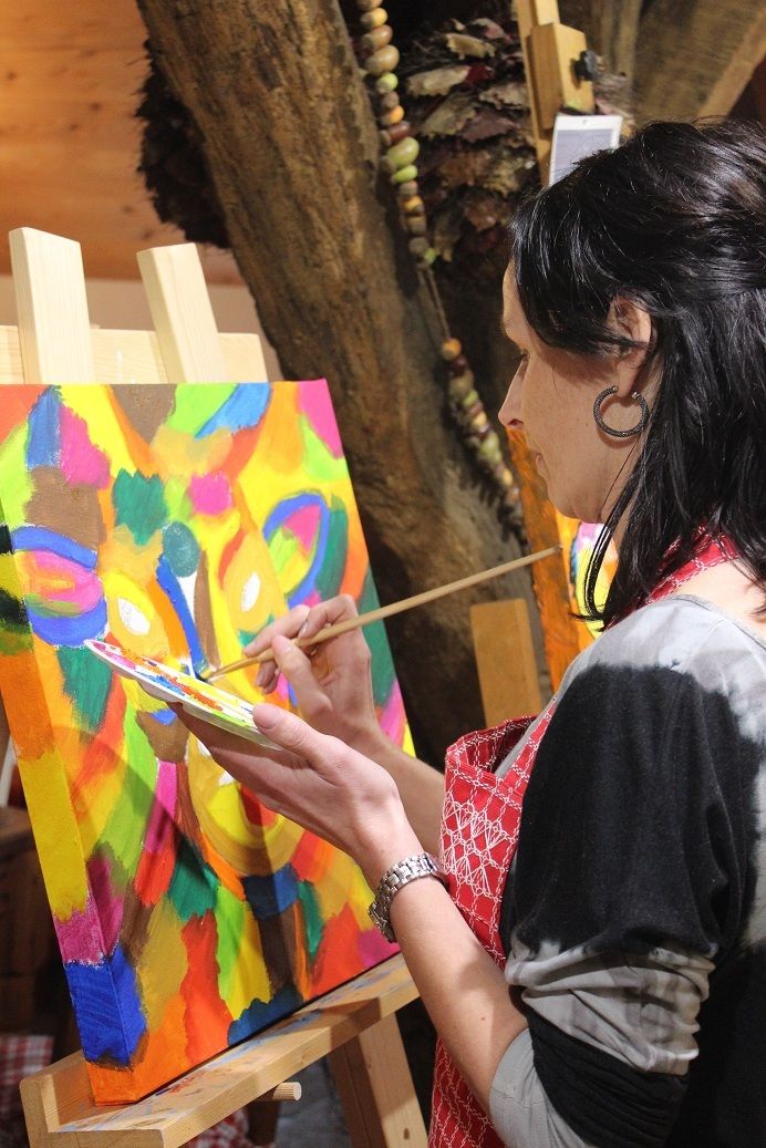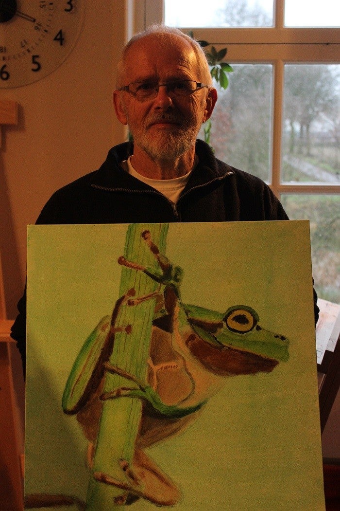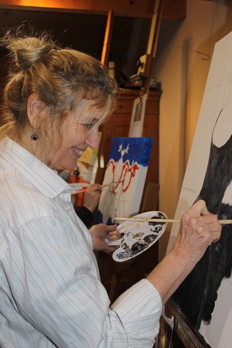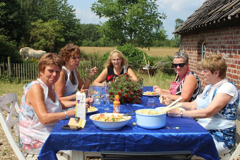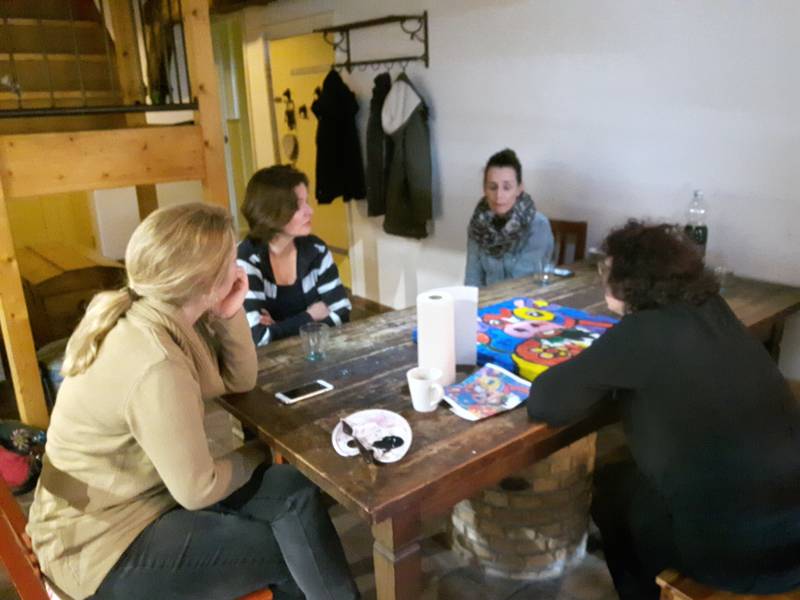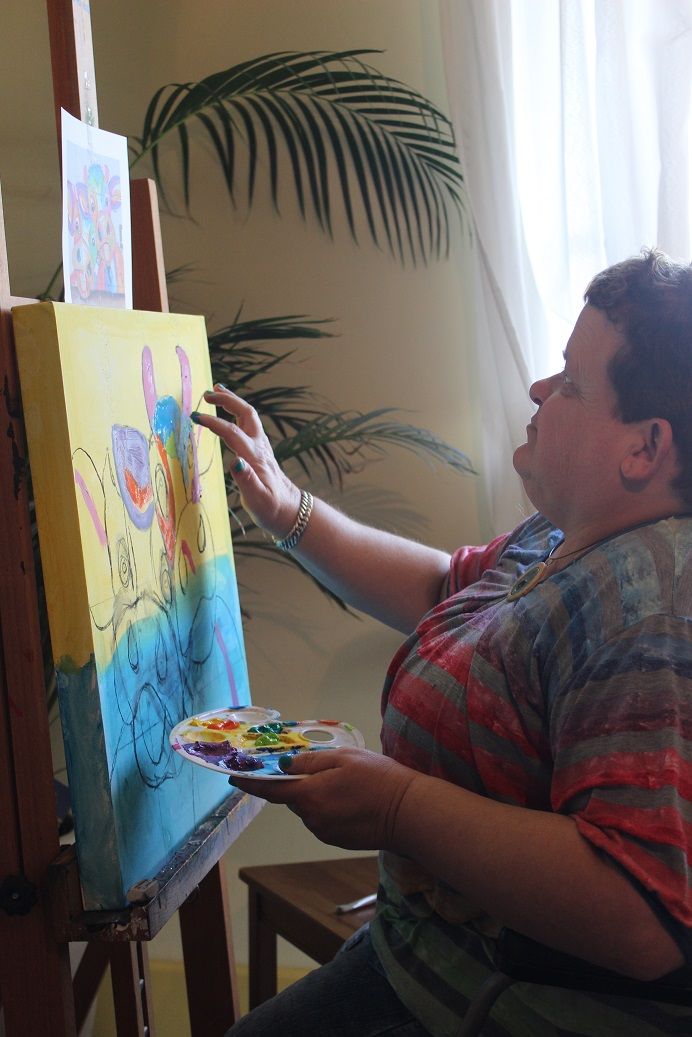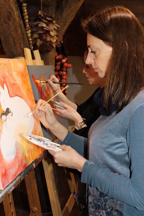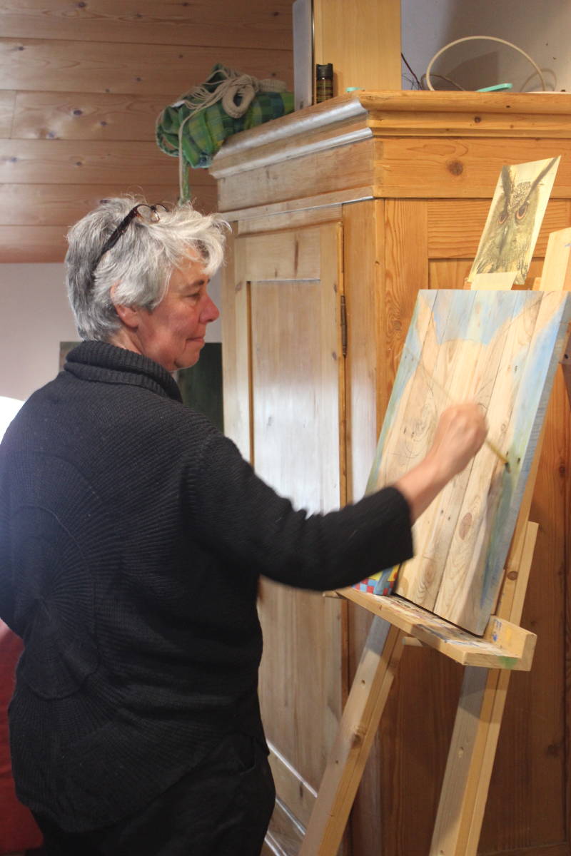 We starten met een kopje koffie of thee en maken een eerste opzet op een doek van 50 x 50 cm. Bij mooi weer schilderen we buiten.